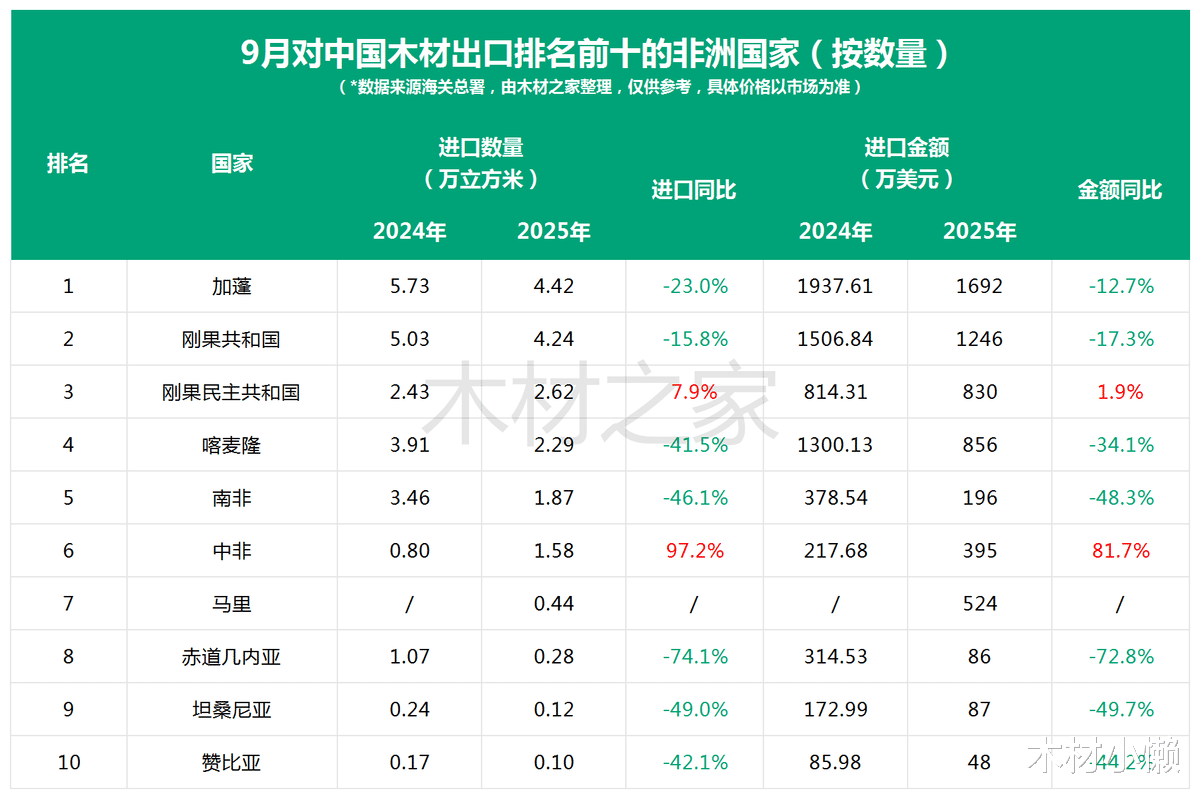 整体上看,2025年1—9月,中国自非洲进口的木材数量累计达到146.95万立方米,同比下降34.4%;进口金额达到4.76亿美元,同比下降32.5%。