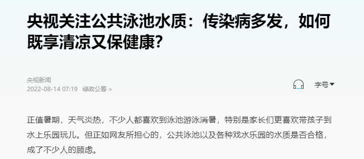 信息来源:央视关注公共泳池水质:传染病多发,如何既享清凉又保健康?——央视新闻2022-08-14