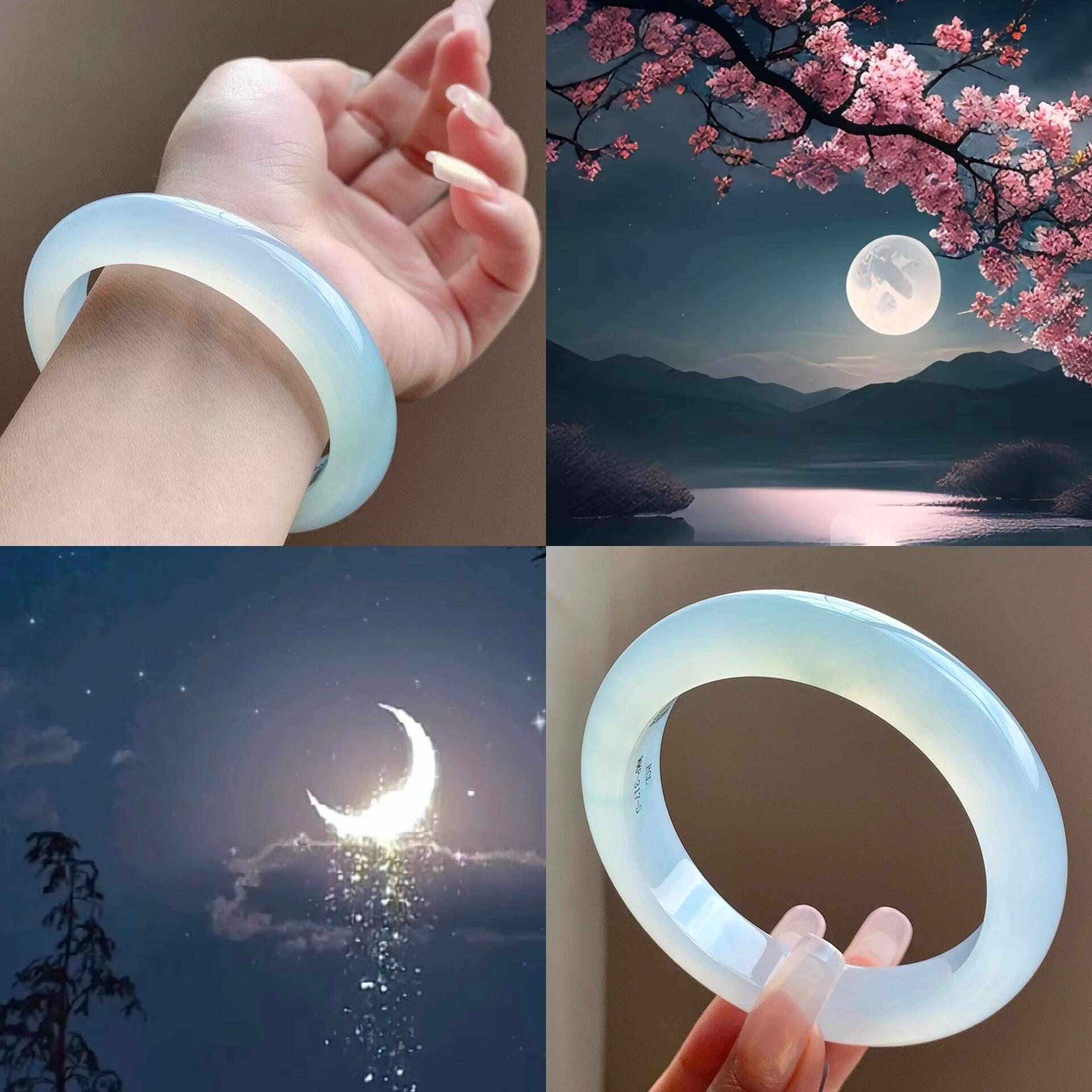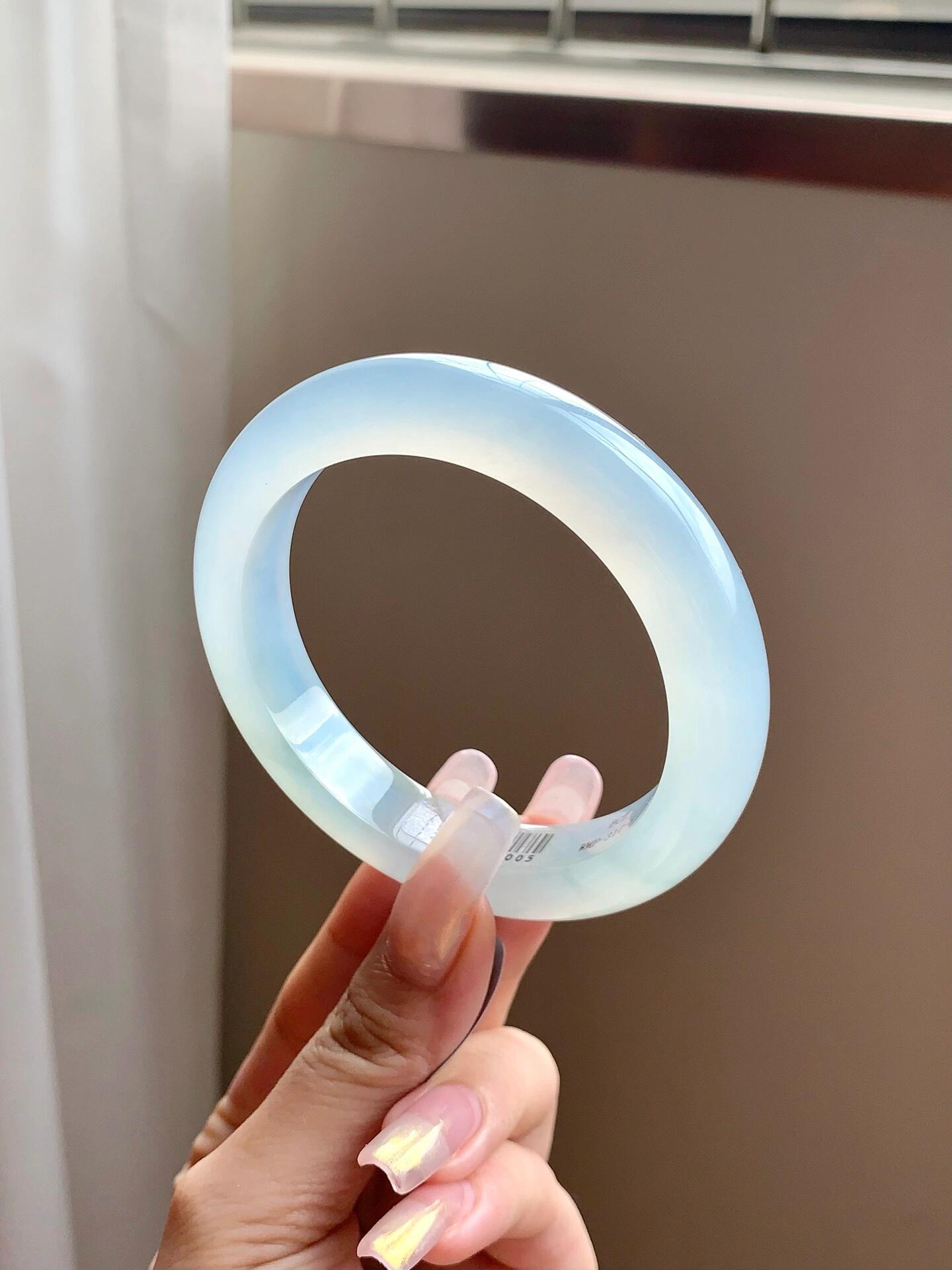 它是那种纯净的白月光底色,就像晴朗夜空中皎月,散发着宁静而又迷人的气息。而飘色的部分更是神来之笔,淡淡的色,如烟如雾,为手镯增添几分灵动与活泼,就像月光下舞动的精灵。