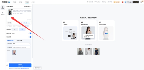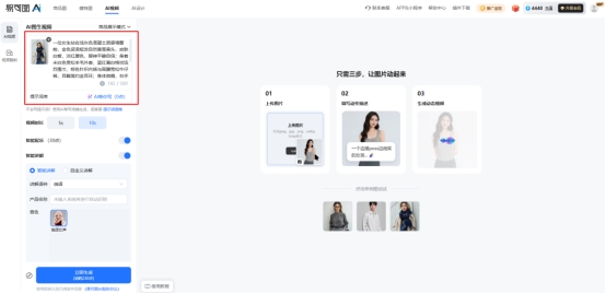 第二步是输入提示词。提示词可以理解为“你想让画面动起来的方式”,最基础的写法是“主体加动作”,比如“产品旋转展示”“人物微笑讲解”等。如果不会写,可以直接使用工具里的自动生成提示功能。