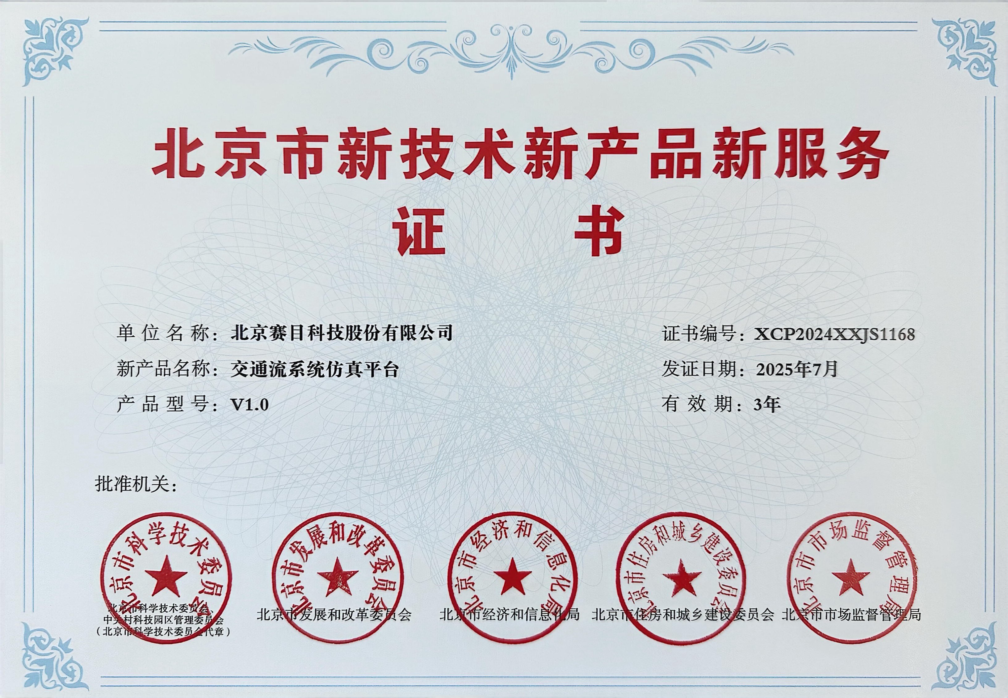近日,北京市第二十批新技术新产品新服务认定名单揭晓,赛目科技自主研发的交通流系统仿真平台——Traffic Pro凭借自主可控的核心技术与广阔的市场应用前景,荣获北京市新技术新产品新服务证书,标志着该平台在智能交通及智能网联汽车仿真领域的技术实力与应用价值获得了官方的高度认可。