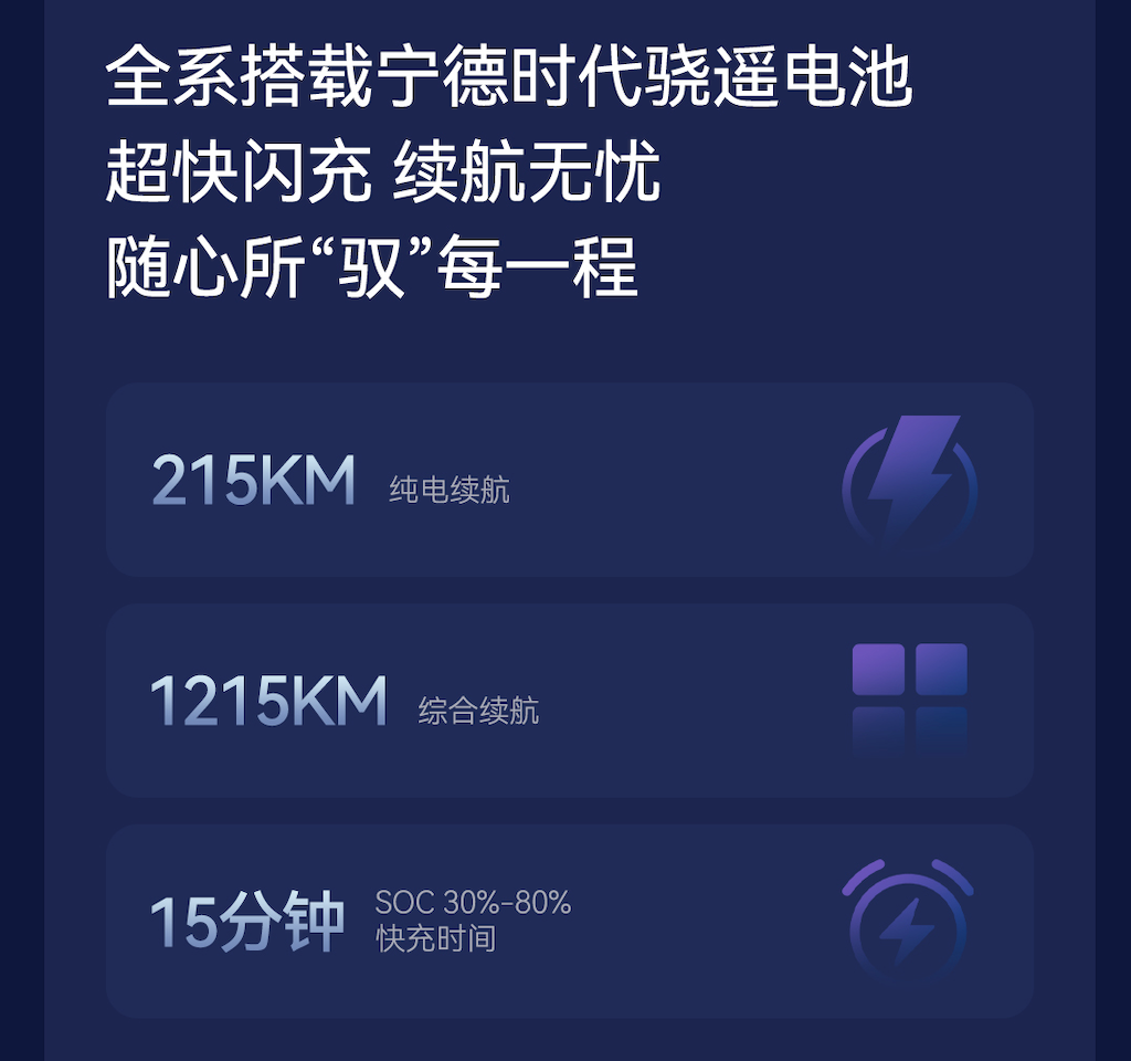 电池系统方面,全系配备的宁德时代骁遥电池组,支持15分钟完成30%至80%电量的快速补给,纯电续航达215km,综合续航里程高达1215km。这种续航与补能效率的平衡,有效拓展了用户的出行半径,契合了家庭用户对长途旅行的需求。