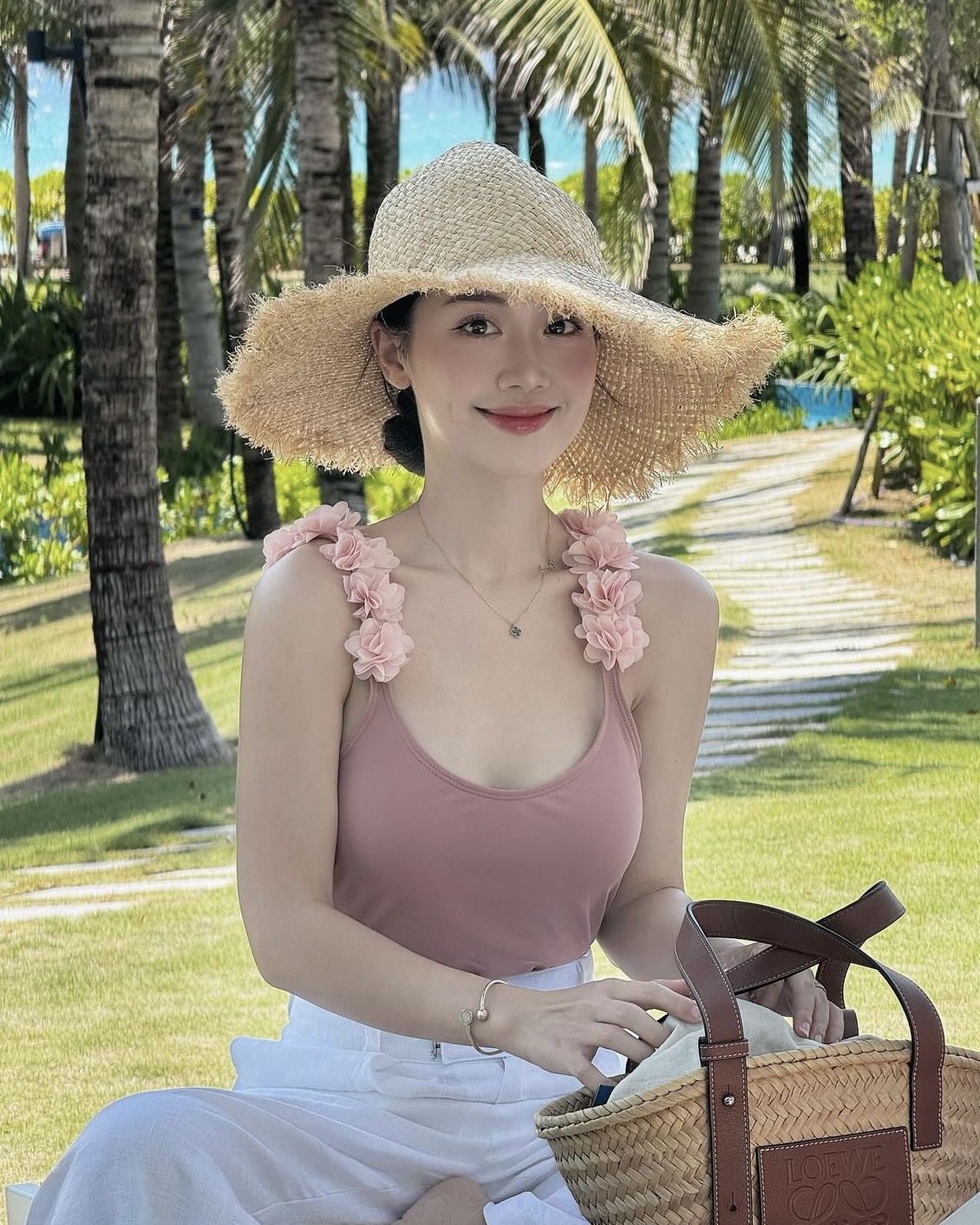 这件背心采用轻盈面料,吊带肩部立体花朵设计,既增添了几分浪漫气息,又不失少女的纯真。吊带设计巧妙地展现了她优雅的肩线和柔美的颈部线条,搭配一条简洁的白色长裤,更凸显了她的清新气质。行走的每一步间,都散发着青春的活力与甜美,让人不禁为之眼前一亮。