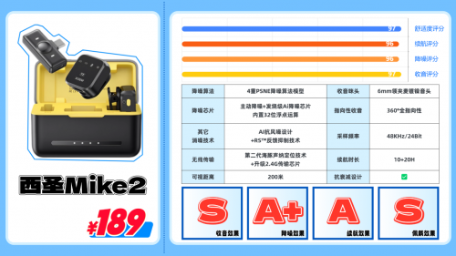 西圣Mike2麦克风专注于打造发烧级性能体验,去除多余功能和型号,专注于一款产品的持续优化。历经数十次升级,优化了200多个性能细节,音质表现、连接稳定性、耐用性均远超竞品。它独创10大黑科技,包括加强版全指向AI感知麦克风、发烧级AI降噪DSP芯片、第二代ALPT高密度拾音技术、4重PSNE降噪算法模型和自研RS™反馈抑制技术等。这些技术使麦克风声音清晰度高达98%,抗噪性达96%,收音效果和稳定性达到旗舰级水准。凭借超高性价比,西圣Mike2在千元以内市场备受好评,被媒体誉为“平价麦克风天花板”。