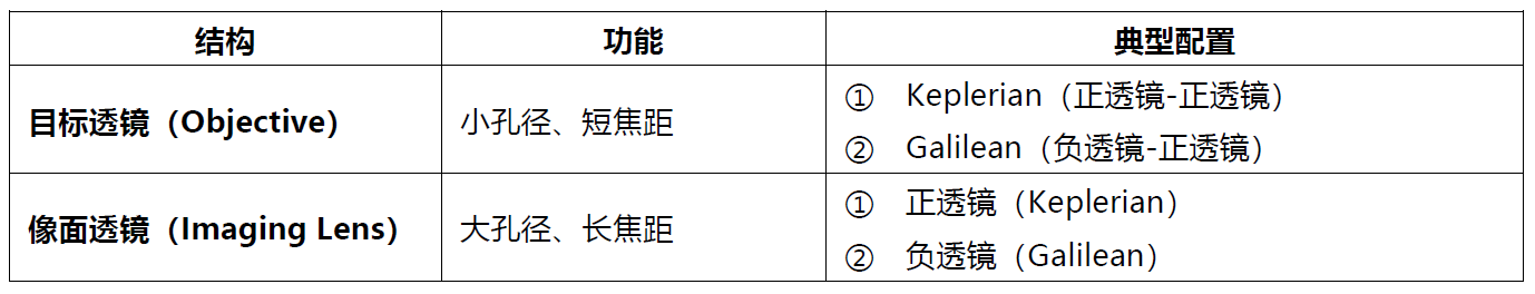 在正向使用时,光束先进入小孔径的目标透镜,被会聚后在其焦点处进入大孔径的像面透镜,最终产生放大的准直光束。