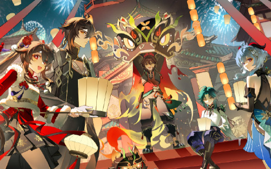 胡桃召集"璃月年夜饭",钟离和温迪推杯换盏。