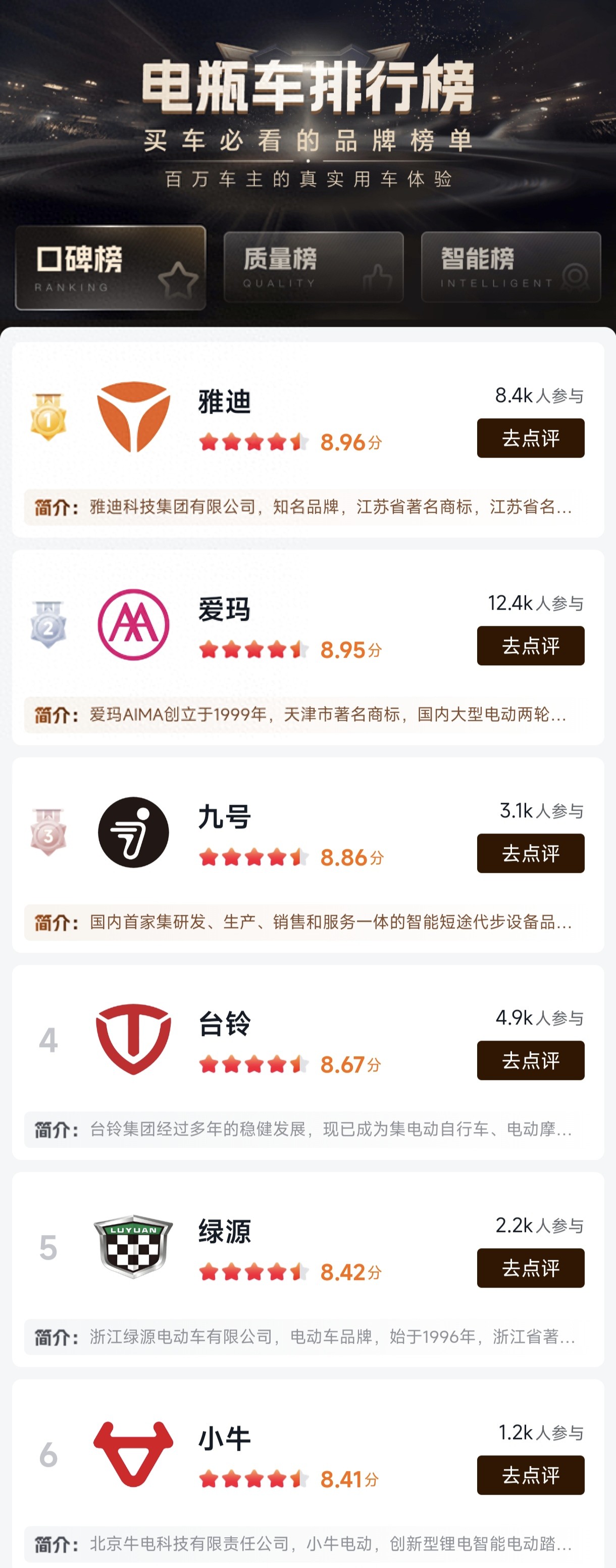 质量榜:考察整车质量及做工,通过用户对车辆可靠性、骑行公里数及售后等评价,形成客观可靠的排名;