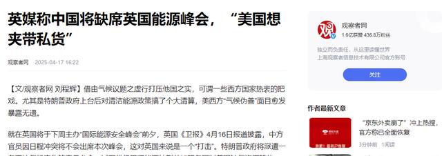《英媒称中国将缺席英国能源峰会,“美国想夹带私货”》——观察者网