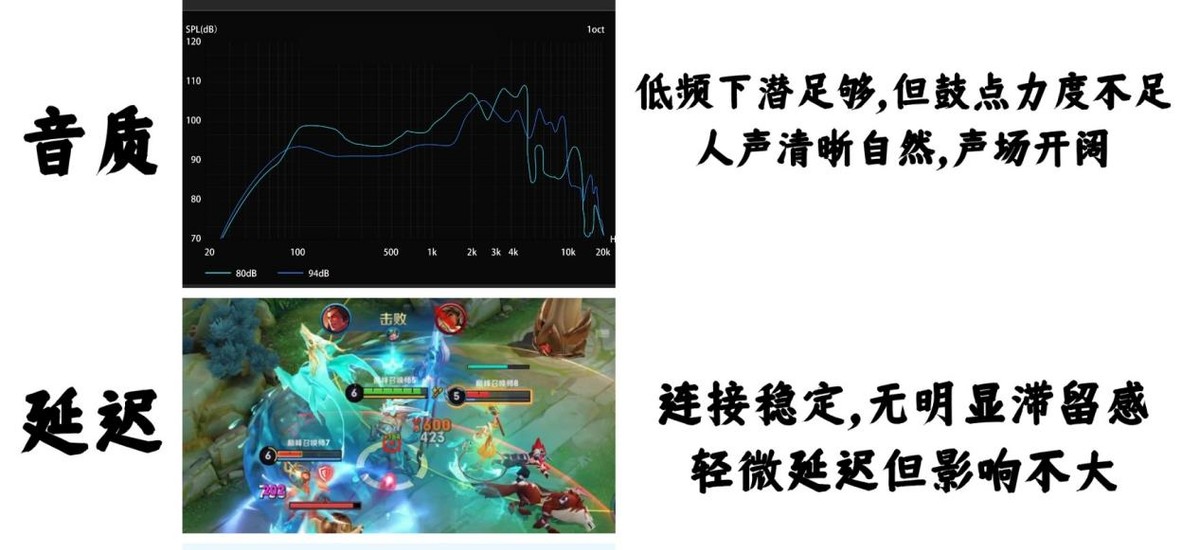 连接和延迟情况:耳机配备5.4芯片,实测连接的稳定性良好,基本没有出现卡顿、断联等情况。打游戏时基本实现音画同步,没有明显的滞留感,但有轻微的延迟感,但是整体影响不大。