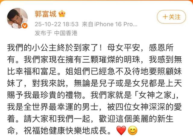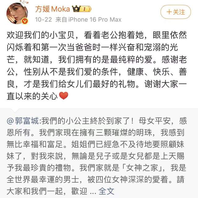 三胎女儿引争议,郭富城回应显格局方媛生下三胎女儿后,外界最关心的反而是“追生儿子”的问题。其实从怀孕开始,就有人传言这胎是儿子,闹得沸沸扬扬。
