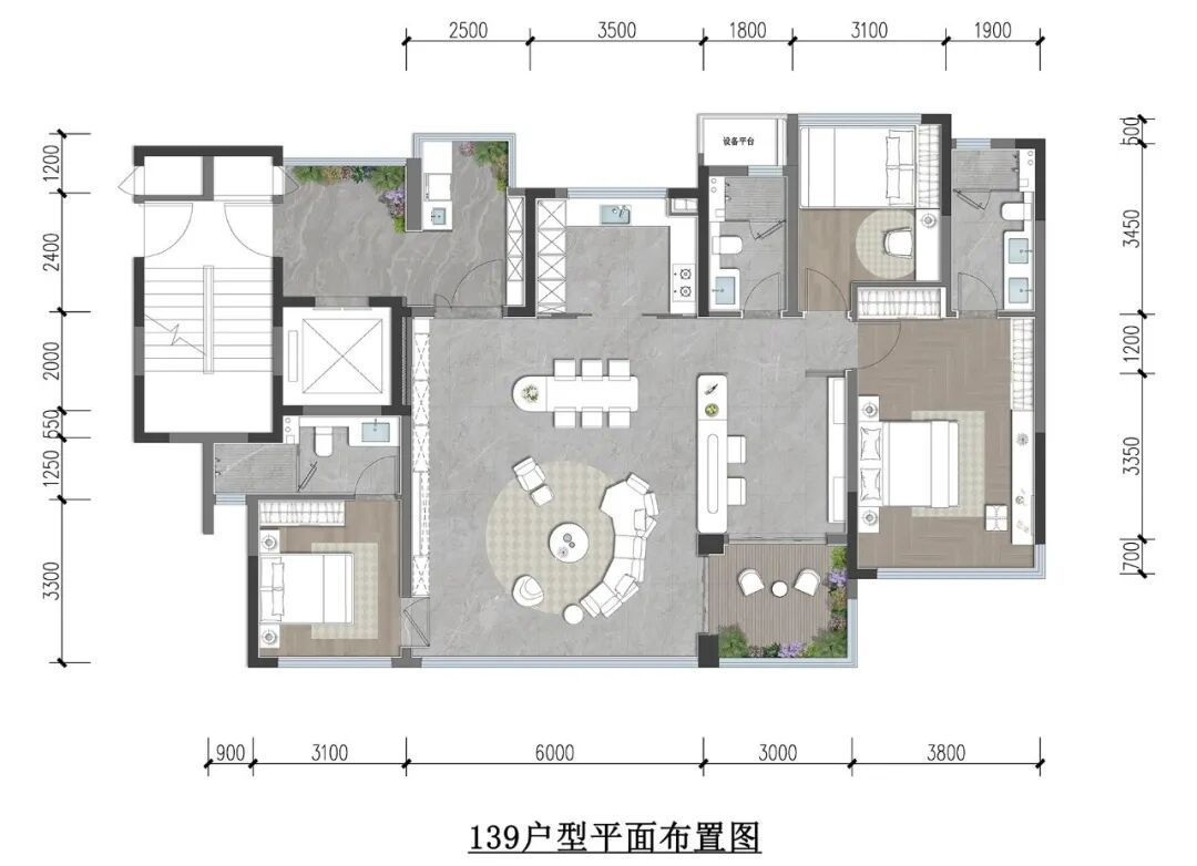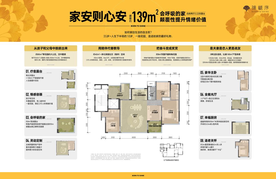 建面约139㎡户型为四房两厅三卫双露台,这一户型更为奢阔,居住体验更壕横——约8㎡双面开窗转角花园、约10㎡多功能房,进阶为墅居品质;3种主卧选择,可焕变约46㎡的花园主卧,比肩市面上约180㎡产品的体验感;南北双露台,庭院尺度同样为引领级别;全生命周期设计,无惧未来家庭结构及居住需求调整。