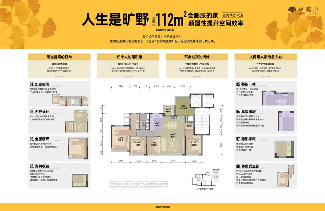在保证高品质居住的同时,锦樾序以新规产品力高分亮相:首批次将推售的建面约112㎡四房,总价300万起,而产品力却是王炸级,做到了5面宽朝南,采光优越;首创LKD无柱化设计,可形成约43㎡阔尺社交厅堂;约21㎡奢享级主卧,含转角开窗及独立衣帽系统;空间灵活幻变,四房可根据需求调整为更为奢享的三房。