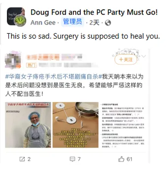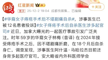 近日,《多伦多星报》(TorontoStar)报道、中国红星新闻等多家国内媒体转载的一则新闻登上微博热搜:59岁华裔女子林梅(MeiLam,音译)在多伦多“知名肛肠专家”阿什温・马哈拉杰(Dr.AshwinMaharaj)的诊所接受痔疮激光手术18个月后,不堪剧痛折磨,最终选择结束生命。