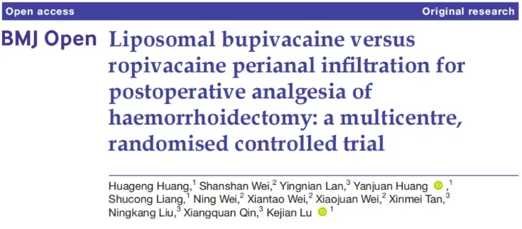 [4]Huang H, Wei S, Lan Y, et al. Liposomal bupivacaine versus ropivacaine perianal infiltration for postoperative analgesia of haemorrhoidectomy: a multicentre, randomised controlled trial[J]. BMJ Open. 2025 Oct 9;15(10):e098484. DOI: 10.1136/bmjopen-2024-098484.
