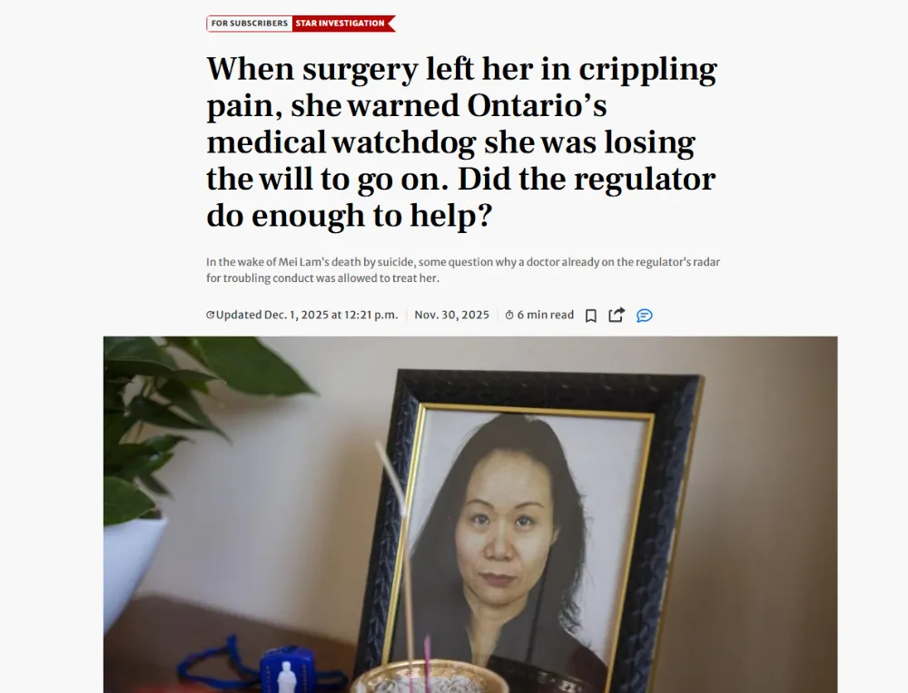 2024年6月复诊时,马哈拉杰无视她的惨状,仍坚持“再做一次激光手术”,被林梅拒绝后便彻底置之不理。走投无路的她向CPSO投诉,多次提及“疼痛快让我活不下去”,但监管机构仅回复“已对医生采取措施”,未提供任何医疗干预或心理支持。2025年8月,在剧痛折磨18个月后,林梅选择了结束自己的生命。