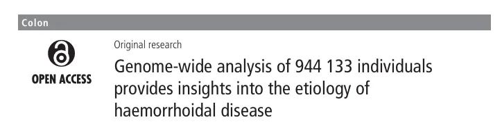 [3]Zheng T, Ellinghaus D, Juzenas S, et al. Genome-wide analysis of 944 133 individuals provides insights into the etiology of haemorrhoidal disease[J]. Gut. 2021 Apr 22;70(8):1538–49. DOI: 10.1136/gutjnl-2020-323868. Epub ahead of print.