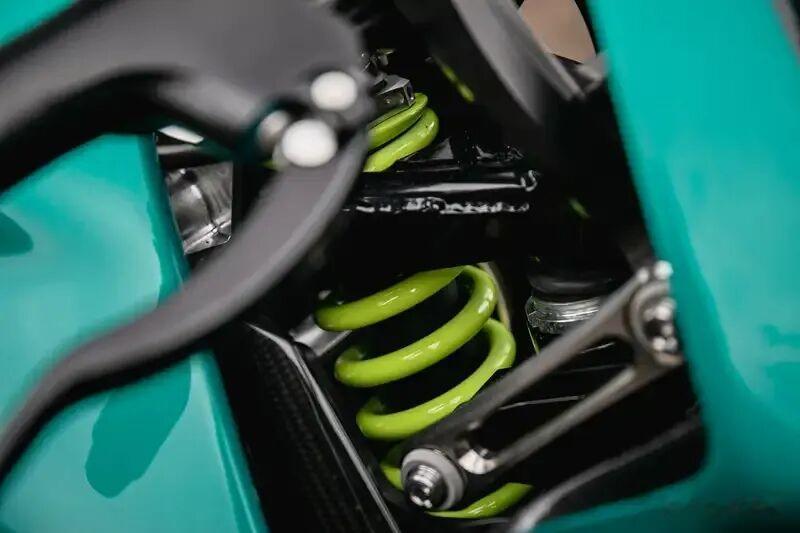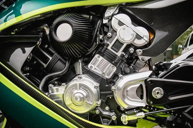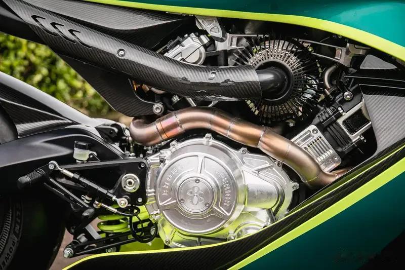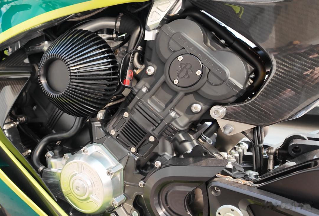 发动机是997cc水冷V双发动机,夹角88度,短行程高转速设计,曲轴箱由AL5000铝CNC成型,强度高,搭配涡轮增压,能输出225匹马力,这台车的推重比已经超过了一部分F1赛车,做到了1.28:1。
