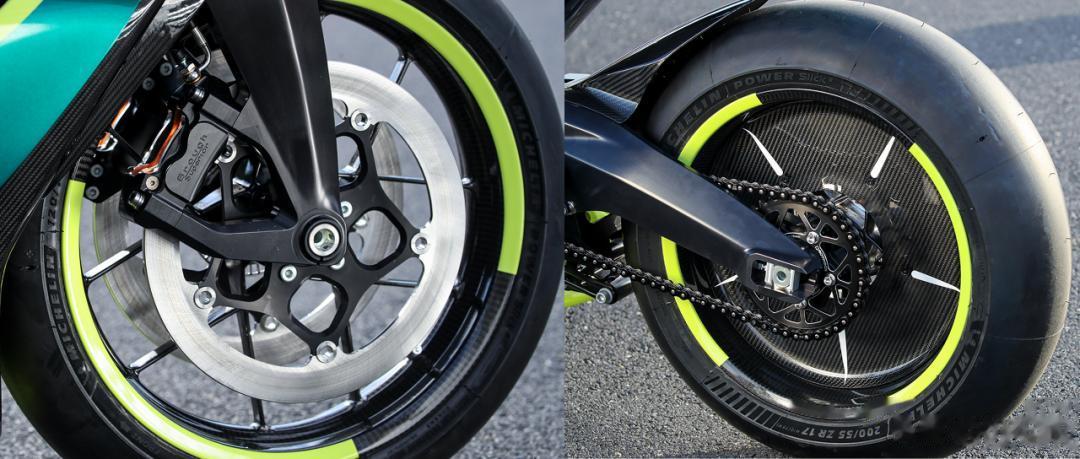 175kg的体重,比杜卡迪V4S都要轻不少,这个体重是材质堆出来的,结构部分使用航空级铝合金,连接处使用钛合金零件,车体使用碳纤维。最有代表性的就是CNC铝合金主车架和碳纤维副车架,小问题:你还知道哪台量产车是这个配置吗?提示:欧洲品牌