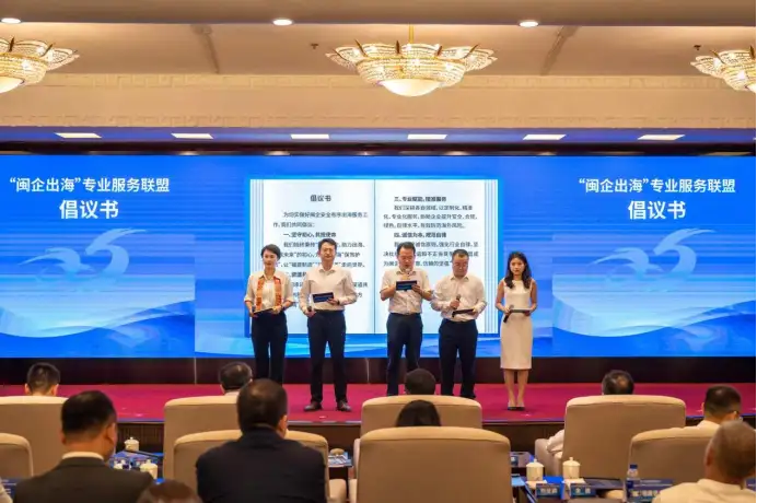 中国出口信保福建分公司、中行福建省分行、北京大成福州律所、厦门航空、深圳万企帮等成员单位代表宣读服务倡议:一是始终秉持“服务闽企、助力出海、共赢未来”的初心,把支持福建企业走向世界作为共同使命;二是加强成员单位间资源共享、互补合作,为企业提供“一站式、全方位、全周期”的专业服务;三是以企业需求为导向,不断提升专业服务水平,助力闽企在全球化道路上行稳致远;四是坚守诚信原则,加强行业自律,让联盟成为闽企出海可靠、信赖的坚强“后盾”。