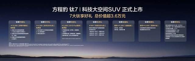 在购车权益上,方程豹更是诚意十足,为首批车主带来了总价值最高超3.6万元的7大钛享好礼!其中包括:覆盖多项座椅舒适配置的总价值10000元舒享升级包、价值3599元的BYD Pad套装、价值4500元的新车交付礼包均免费送;提供3年0息、5年低息、0首付起或至高84期等多重金融方案以供选择,金融贴息最高价值11300元;还有最高价值6000元的置换补贴、价值900元的智慧生态礼包,以及2年5G每个月的免费车机流量、非营运车辆c每一个家庭都能轻松拥抱钛7,让美好生活触手可及。
