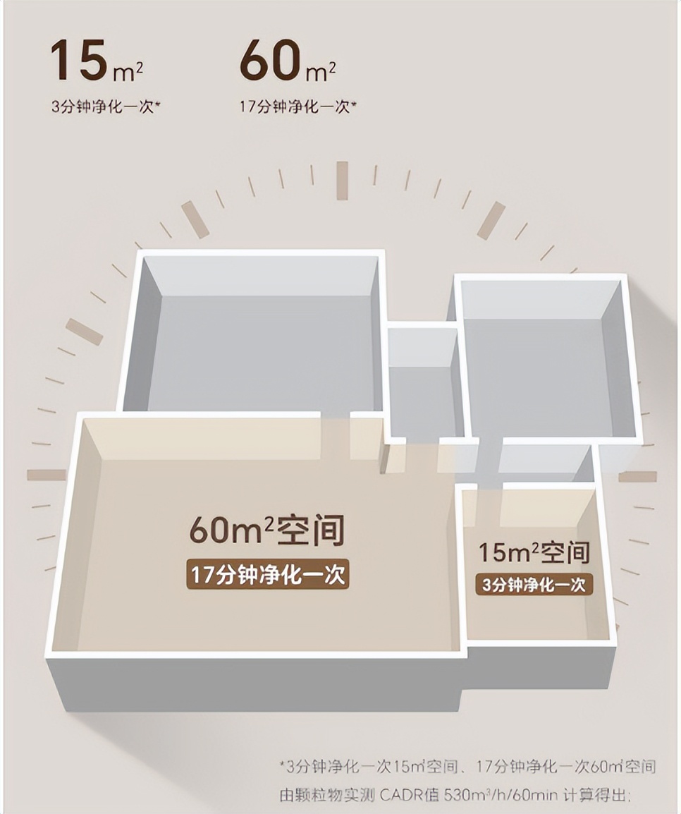 PM2.5 CADR 值 530m³/h,远超同体积迷你净化器(多为 200-250m³/h),官方标注适用面积 20-50㎡,完全适配租房常见的小卧室、客厅;