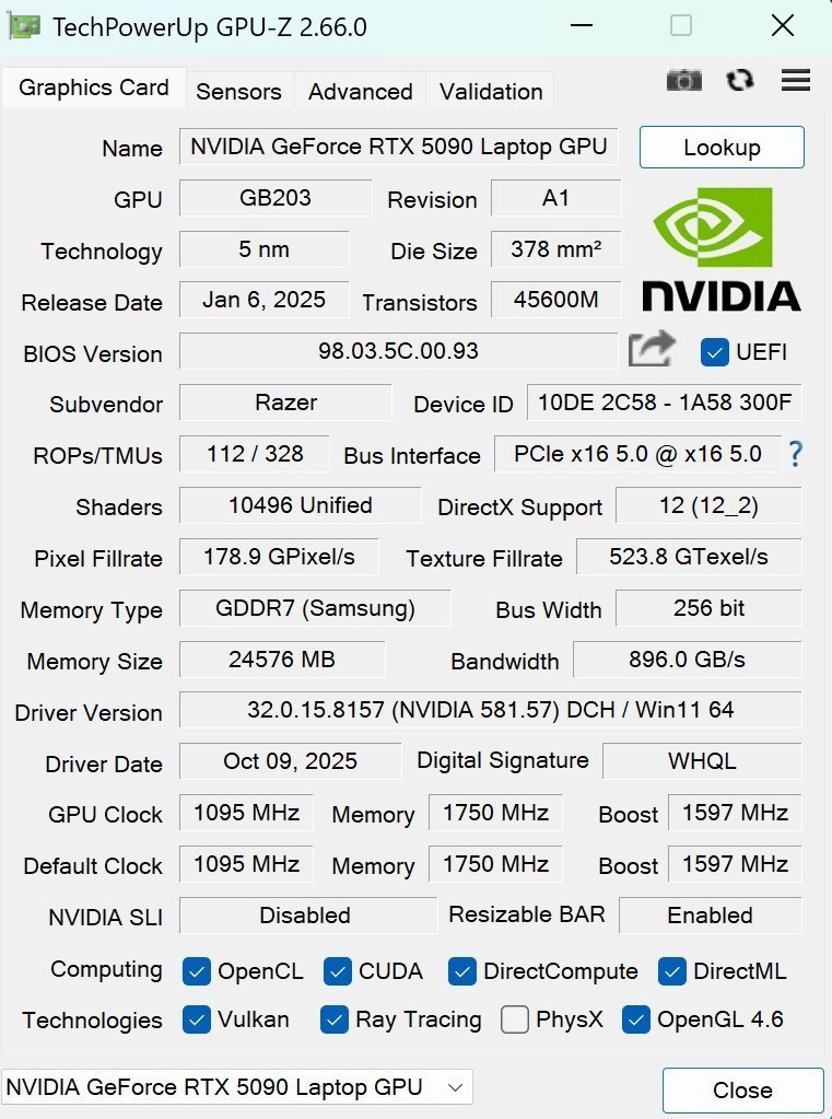 显卡方面,GeForce RTX 5090笔记本电脑GPU拥有高达10496个CUDA核心,显存为24GB GDDR7,像素填充率和纹理填充率分别为178.9 GPixel/s和523.8 GTexel/s,ROPs单元112个,带宽256bit,带宽速度为896GB/s,高性能模式下核心频率来到了1095MHz,显存频率1750MHz,Boost频率1597MHz。