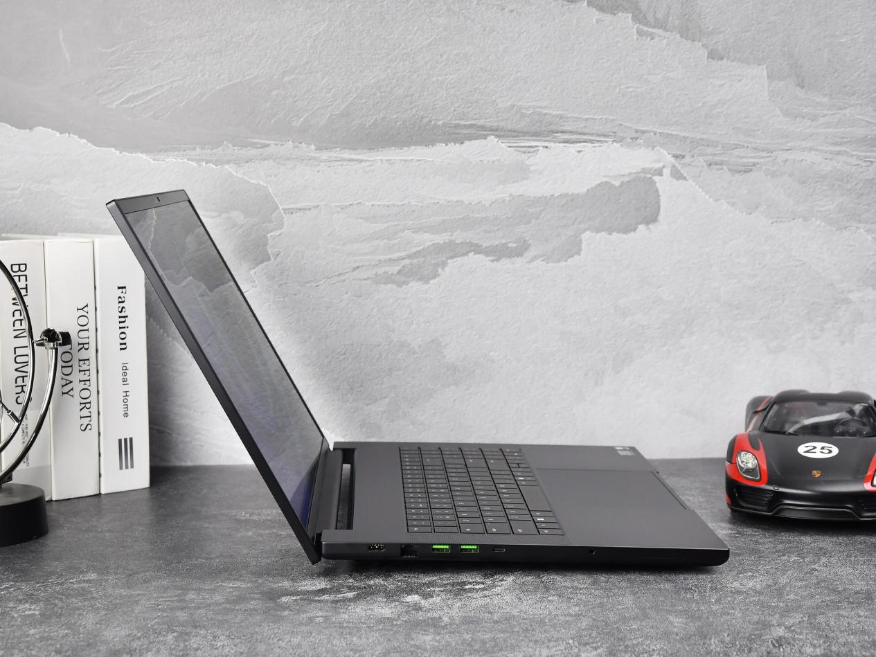 从机身侧面看过去,雷蛇灵刃18 2025无论是屏幕还是机身,都显得非常纤薄。此外,这款产品采用了通体采用了CNC铝合金一体化机身,纯黑配色加上雷蛇标志性的绿色做点缀,以及A面正中能够发出绿色光芒的雷蛇LOGO,无处不在传承着雷蛇品牌的家族式设计语言。