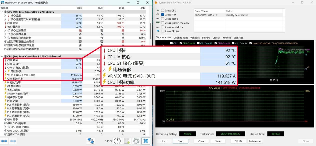 从理论测试和应用测试来看,雷蛇灵刃18 2025为酷睿Ultra 9 275HX提供了非常出色的性能释放空间,通过AIDA 64 FPU CPU单烤机测试可以看到,在高性能模式下,酷睿Ultra 9 275HX处理器功耗释放可以达到141.618W,而封装温度为92℃,整体表现不错。