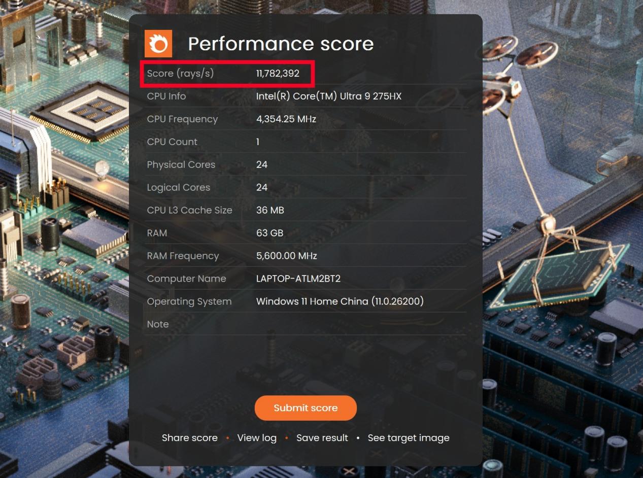 光线渲染方面,我们参考Corona 10 Benchmark的测试,可以看到酷睿Ultra 9 275HX每秒可以渲染11782382条光线,效率还是相当可观的。