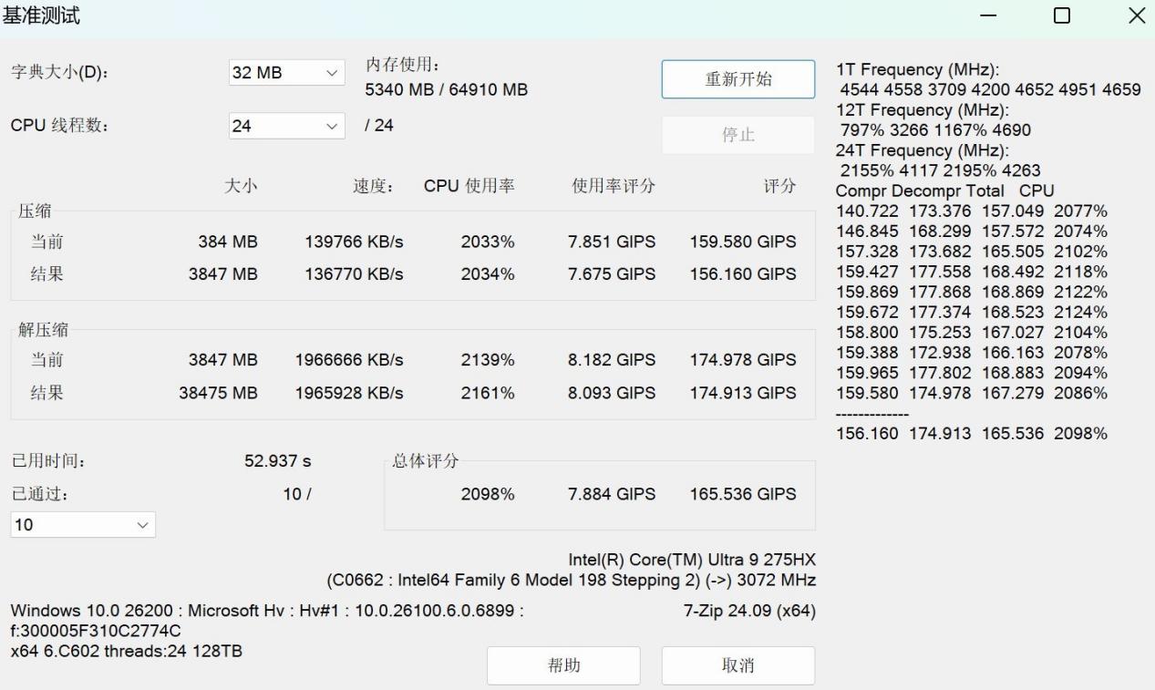 单核和多核理论性能了解之后,我们来看看处理器应用方面的性能表现。首先是7-ZIP压缩/解压缩测试,由于取消了超线程,所以酷睿Ultra 9 275HX处理器的压缩速度只有136770KB/s,不过解压缩速度还是能够达到1965928KB/s,综合评分165.546GIPS,完成10轮压缩/解压缩测试耗时仅为52.937秒,满足日常应用没啥问题。