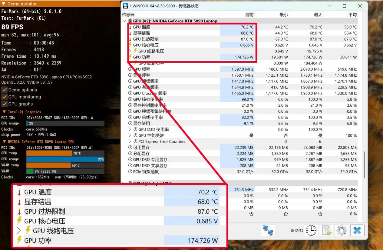 GeForce RTX 5090笔记本电脑GPU满功耗为175W,雷蛇灵刃18 2025自然可以轻松稳定在175W功耗释放,而且GPU平均温度仅为70.2℃,散热系统的效率相当出色。