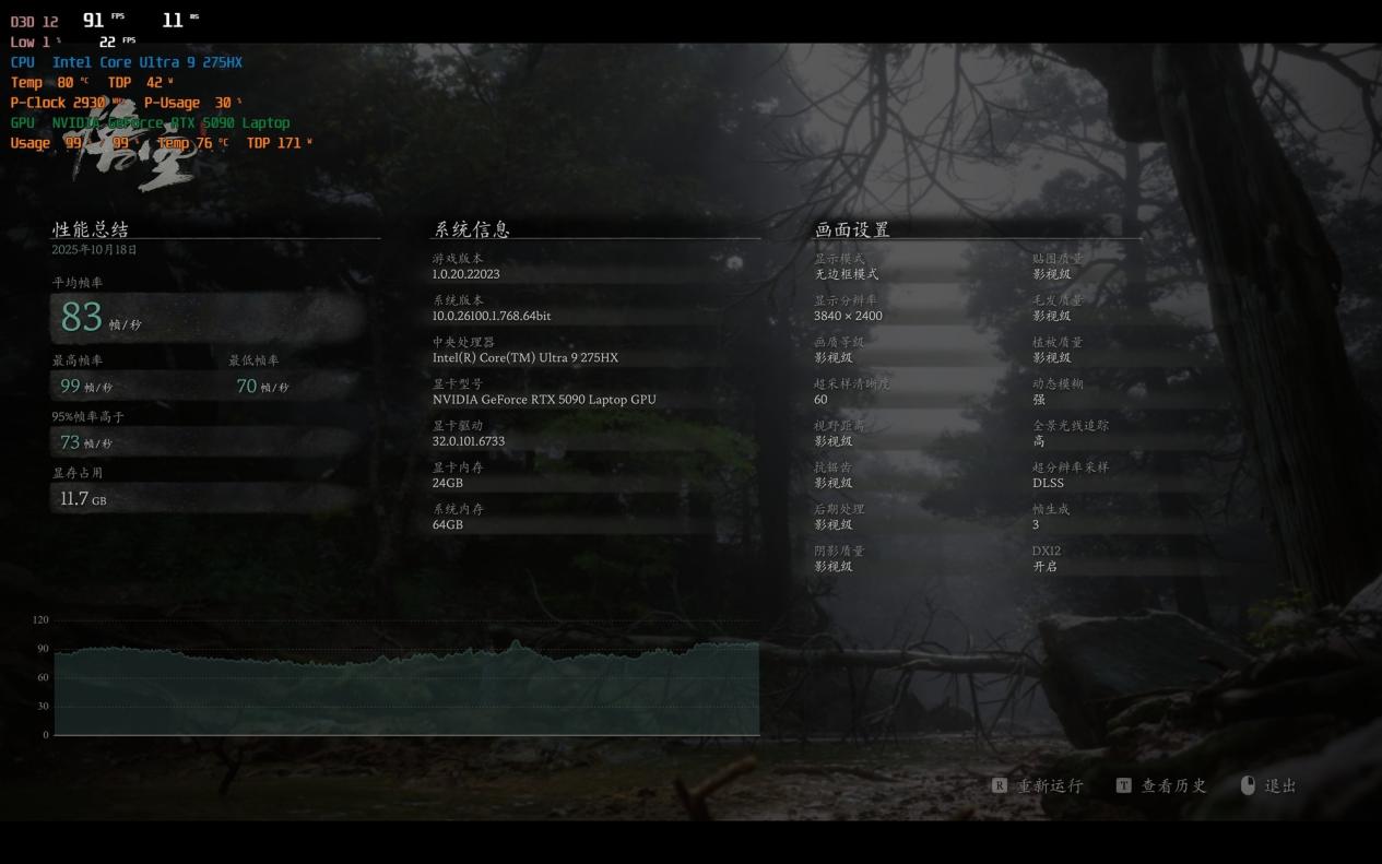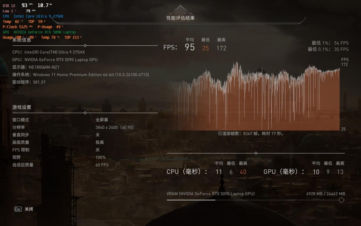 在强劲的功耗释放基础上,雷蛇灵刃18 2025在应用端完全没有瓶颈,而在游戏端,得益于酷睿Ultra 9 275HX处理器和RTX 5090笔记本电脑GPU,自然也是完全没有瓶颈,接下来我们看看雷蛇灵刃18 2025在游戏方面的具体表现。