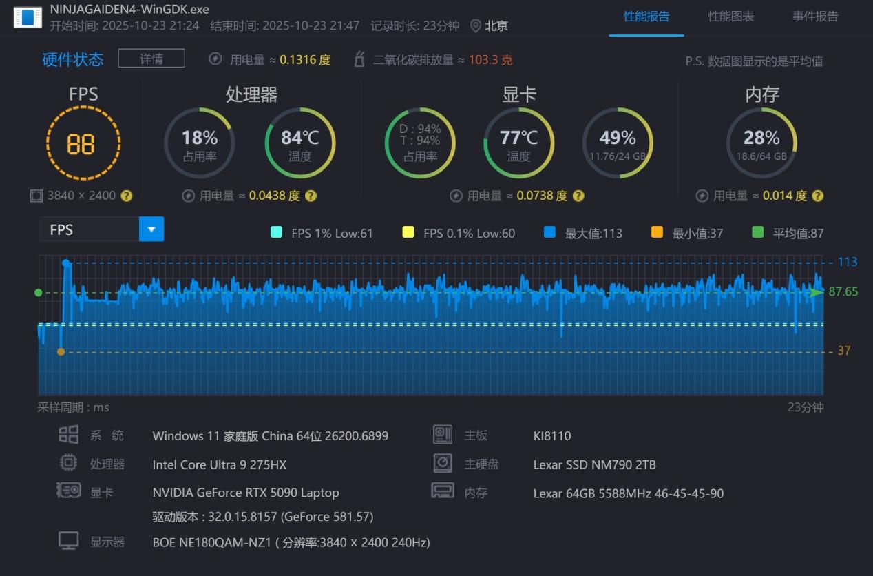 《忍者龙剑传4》是近期新发布的忍龙系列正统续作,在硬核动作基础上简化了操作难度,吸引粉丝的同时也很适合新玩家入坑。在4K分辨率、最高画质、DLSS平衡模式下,实测画面平均流畅度可以达到88fps,另外1% LOW帧也能够达到60fps,流畅无卡顿、无延迟的画面对于这种高速硬核动作游戏来说非常重要。