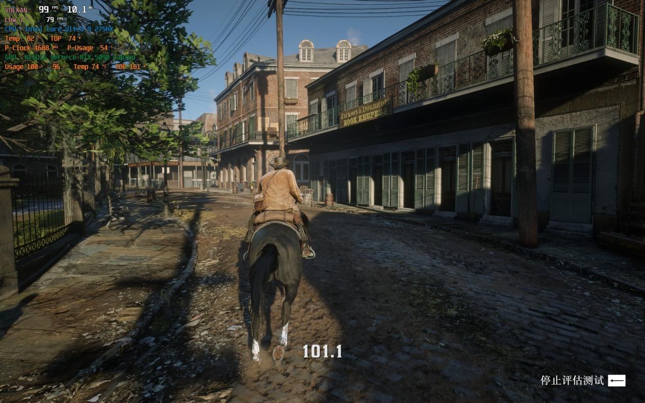 《荒野大镖客2》同样是在4K分辨率、最高画质以及DLSS平衡模式下进行的测试,平均帧率可以达到87fps,运行极为流畅。