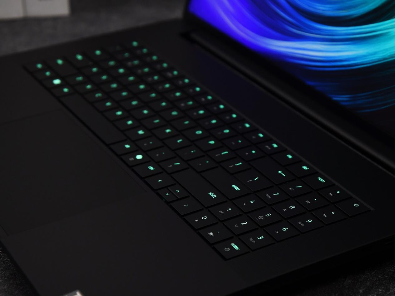 雷蛇灵刃18 2025整个C面的设计更是将简约风发挥到极致,规整的键盘布局,硕大的触控板和腕托区域,加上左右侧扬声器,构成了极简美学。其键盘支持Razer Chroma RGB幻彩灯效,亮度调节范围极大。右侧终于是配备了独立数字键区,支持4个专属可编程宏按键,键盘按键键程为1.5mm,适中的键程设计加上利落的回弹反馈以及63克触发压力,带来了极为舒适的敲击体验。不过为了保持键盘区域的规整,雷蛇灵刃18 2025的方向键上下键并未采用全高设计。