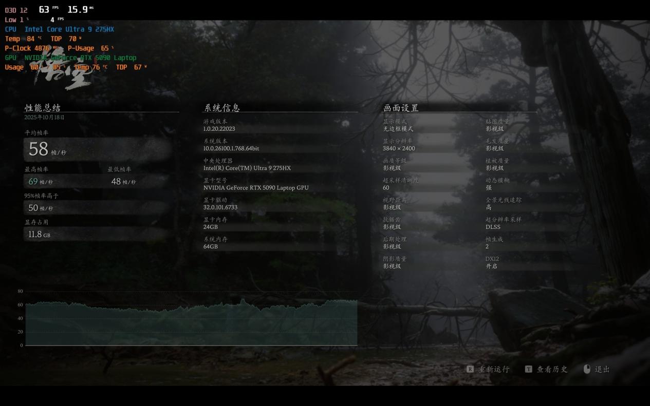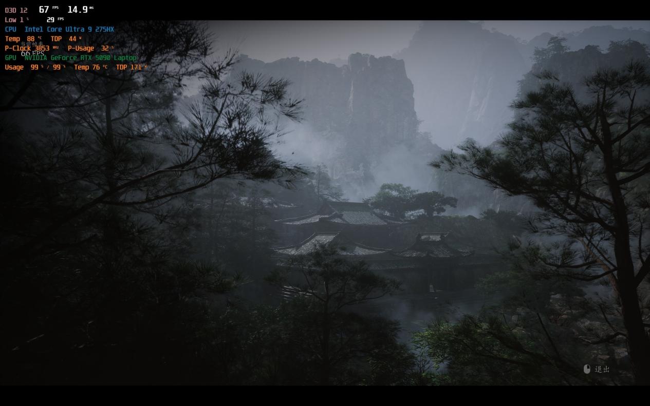 首先是《黑神话:悟空》。测试时依旧是4K分辨率、开启光追和影视级画质,这对于RTX 40时代的游戏本来说绝对是噩梦般的设定。