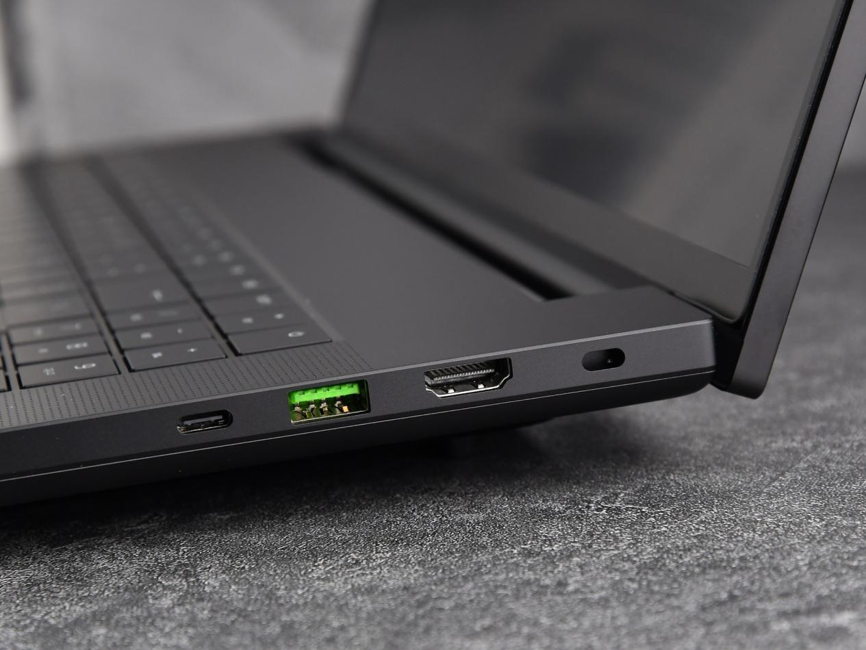 由于采用了内吹散热架构以及下沉式屏轴设计,所以雷蛇灵刃18 2025机身尾部并未设计接口。其机身右侧配有安全锁孔、HDMI 2.1视频输出端口、USB 3.2 Gen 2 Type-A接口、雷电5接口(带电源输出)以UHS-II SD读卡器插槽。