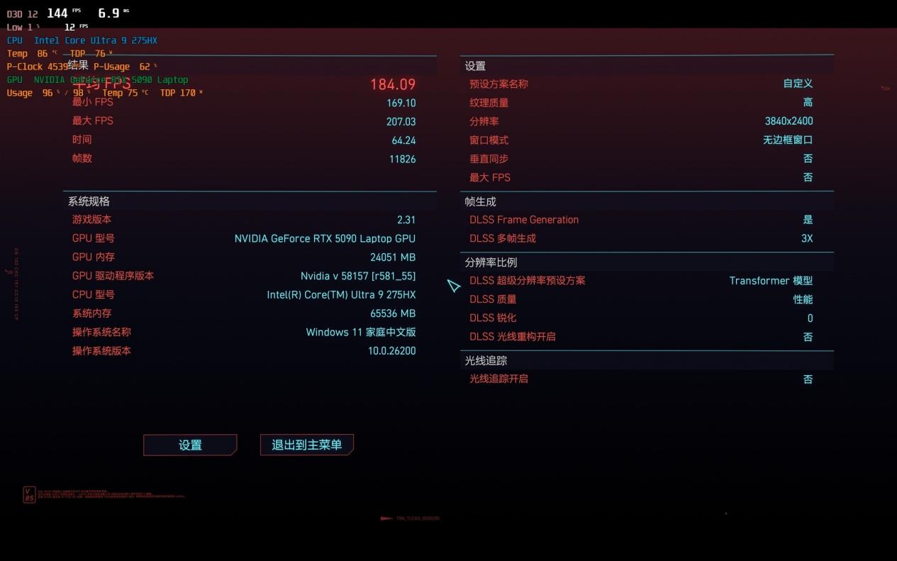 另外一款游戏就是《赛博朋克2077》了,开启超速光追,4K分辨率,未开启多帧生成、但是开启光线重构的情况下,画面平均帧数为61.35fps,而分别开启2X、3X、4X多帧生成的情况下,平均帧数分别达到了131.12fps、184.09fps以及219.76fps,帧数提升显著。而且4K+全局光追的效果充分展现出了《赛博朋克2077》这款游戏绝美的未来科幻场景。