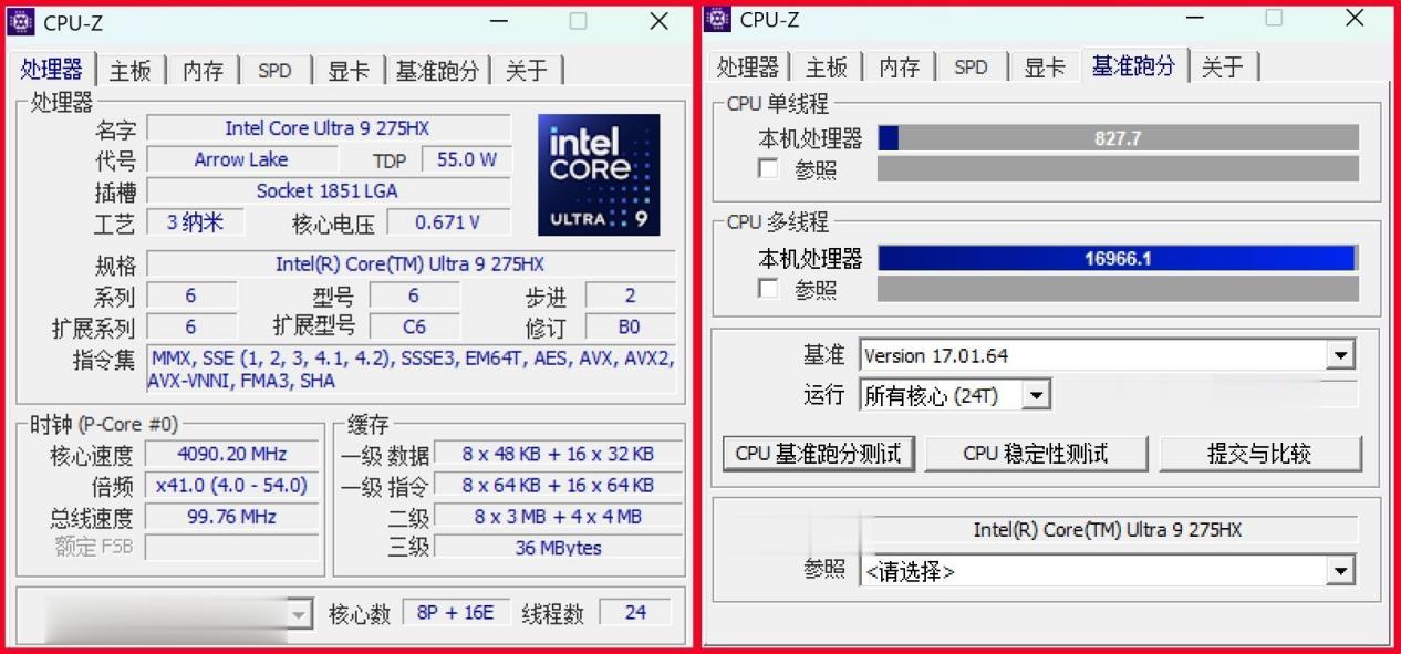 首先来看处理器,雷蛇灵刃18 2025之所以能够继续保持纤薄设计,与酷睿Ultra 200HX系列出色的能效比密切相关。它搭载的酷睿Ultra 9 275HX采用24核24线程设计,由8个性能核+16个能效核构成,睿频加速频率5.4GHz,拥有36MB三级缓存,默认TDP为55W,最高TDP可以达到160W。CPU-Z单核得分827.7,多核得分16966.1,总体性能释放非常不错。