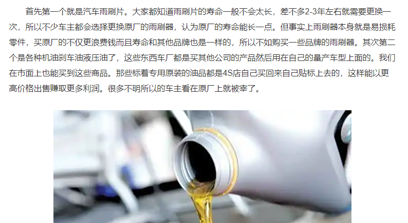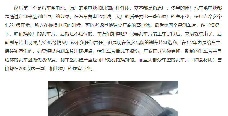小编认为以上4种部件是不用更换原厂件的,这些都是自然耗材,副厂件和原厂件差价还是很大的,有些根本没有原厂的说法,当然,对于爱车部分核心的安全零部件,比如电脑主板,发动机内部问题的,我们还是要去4S店去做专业检查维修,这个是在他们的服务范围之内的。