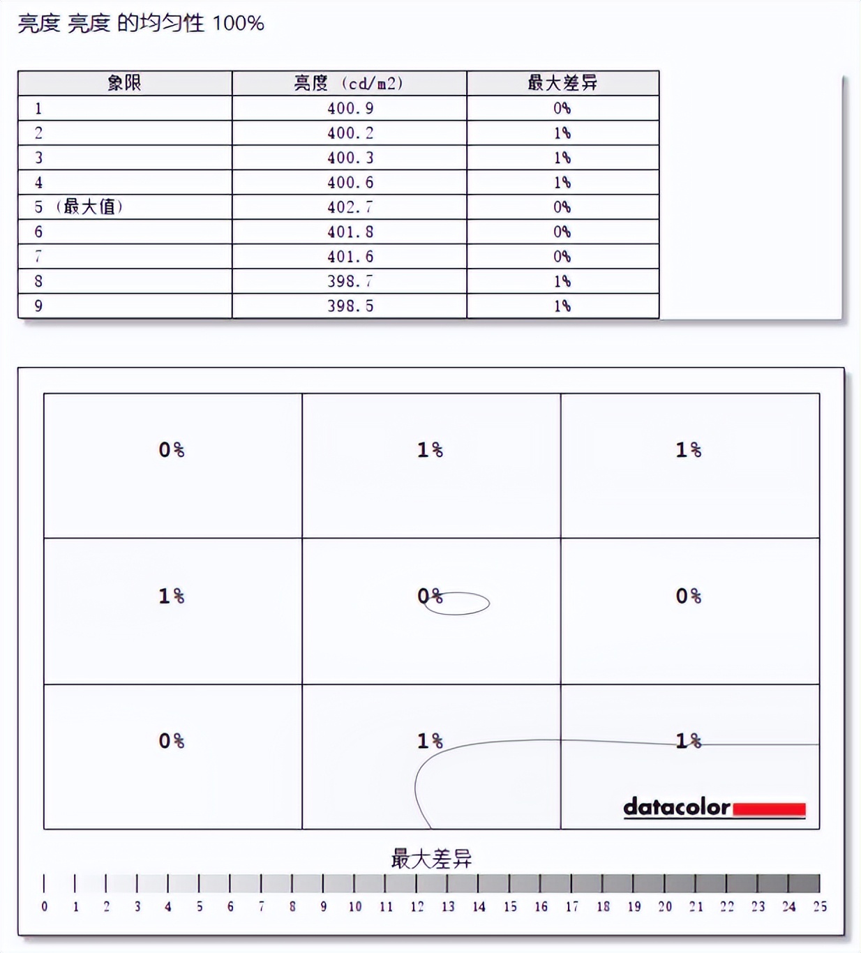 亮度均匀性的测试中,GS27QES显示器整体表现相当优秀,亮度最大为中间第5象限,最大差异在第9象限,差值为4.2cd/m²。