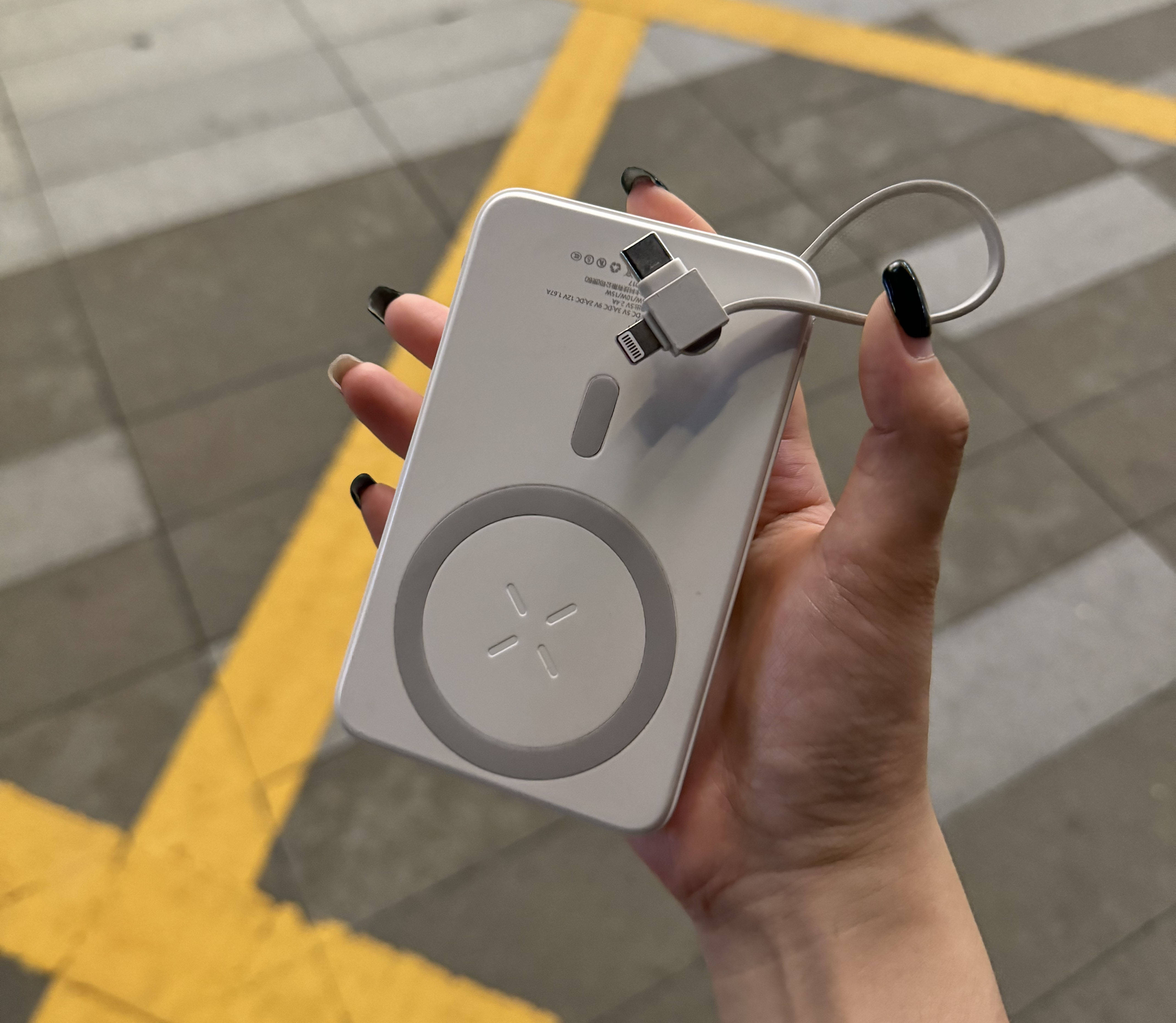 另外,这款充电宝体积小巧,却贴心地配备了一根内置数据线。充电时无需额外操作,直接拉出数据线就能立即开始使用,既方便又高效。
