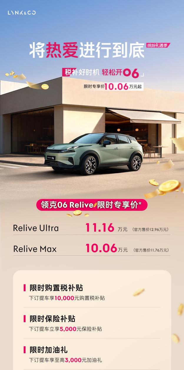 领克06 Relive不仅在产品力上表现出色,还为消费者提供了极具吸引力的购车权益。在11月,领克06 Relive推出了多重购车优惠,包括下订提车享10000元购置税补贴、下订提车立享5000元保险补贴、下订提车享至高3000元加油礼,以及5年期贷款10万3年0息,月供低至1668元起的金融礼等,限时专享价仅10.06万起。