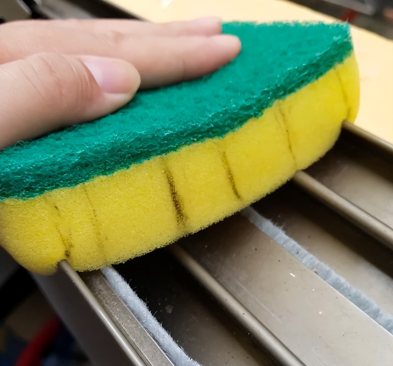 在用裁剪之后的海绵擦,来擦拭家中的窗户缝隙,好用又方便。
