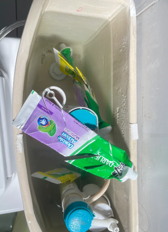 那为什么不试试把牙膏皮,剪成鱼骨装,在放入到马桶的水箱中,用来冲厕所呢?