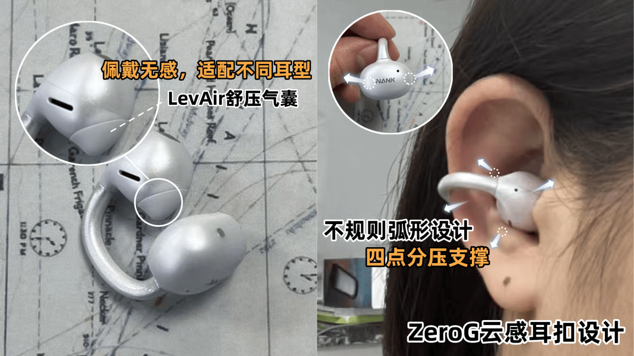 作为做开放式耳机的老牌团队,南卡在佩戴上一直做得很稳。这次ClipSuper2的佩戴体验可以说是同价位最舒服的之一。它用了ZeroG云感耳扣设计,通过不对称弧形耳夹做四点分压,再加上LevAir舒压气囊,戴上之后是那种“贴合但不压耳”的感觉。单只只有4.8g,很轻,耳夹弧环还是航空级钛合金骨架配合记忆材料的,不仅柔韧性特别好,实测上万次弯折都不变形,还能适应不同耳型自动调整受力,让耳朵长时间戴也不会酸疼。跑步、通勤、办公都稳稳的,舒适度确实做得不错。