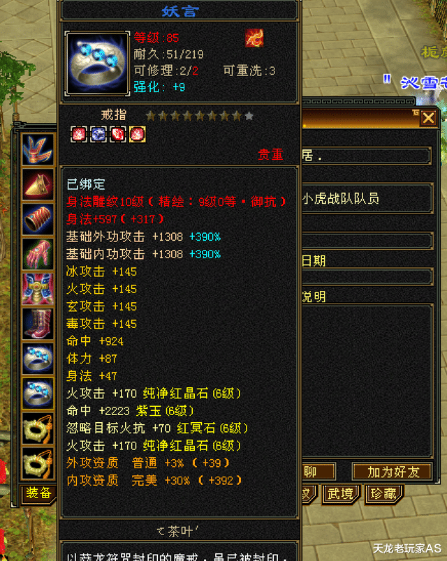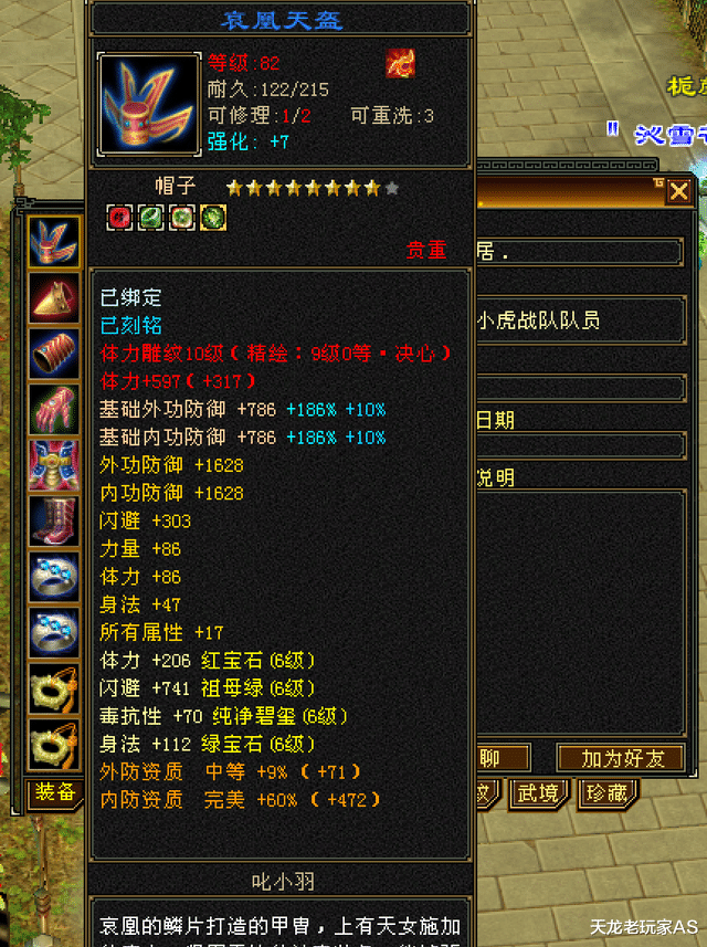 帽子也是深蓝大八星:双防、闪避、力量、体力、身法、所有属性!如果再来个会防,这帽子也是全服能排前十的!