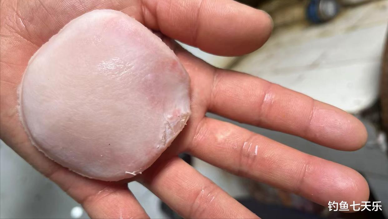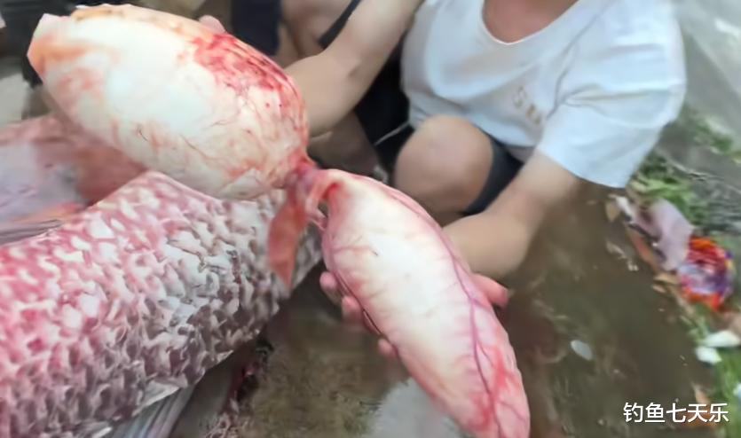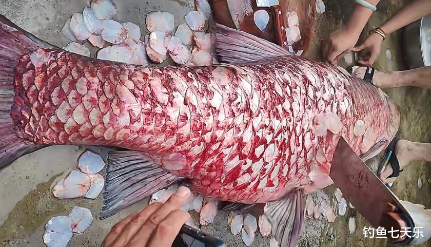 男子没有卖鱼,而是把它带回家宰杀了。从鱼肚子里掏出的鱼鳔,就有半米多长,用铁锹刮下来的鱼鳞,一个就有鸡蛋那么大。