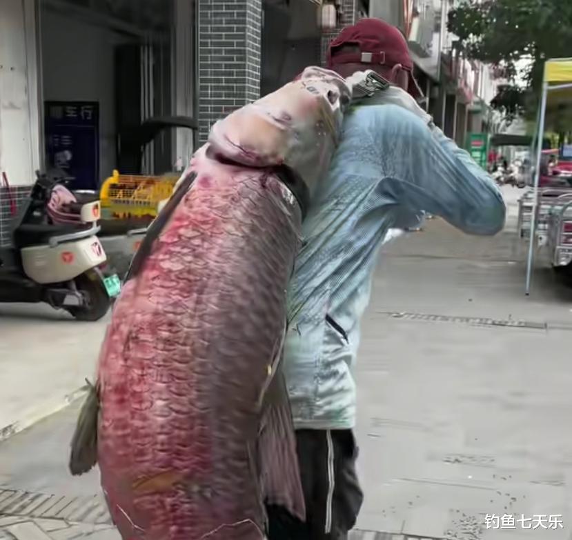 大青鱼被遛上岸之后,这位钓鱼大哥背着它一路小跑,而且是专往人多的地方去。