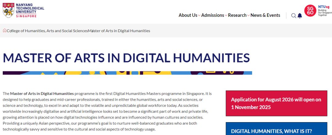数字人文艺术硕士是新加坡首个结合数字工具与人文探究的硕士课程。课程旨在培养兼具技术能力与人文洞察力的人才,解决数字化时代的文化和伦理问题。